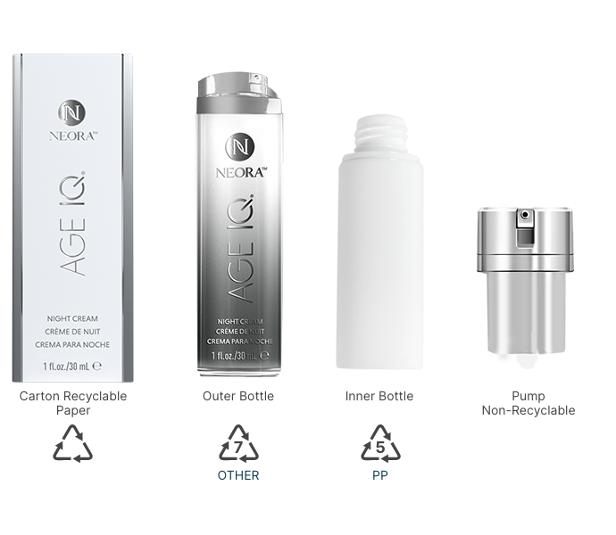 As part of the Neora Green Initiative, we’re striving to make our packaging as eco-friendly as possible. Here’s a simple guide to show you which parts of our packaging you can recycle today. Thank you for doing your part to help the environment.
